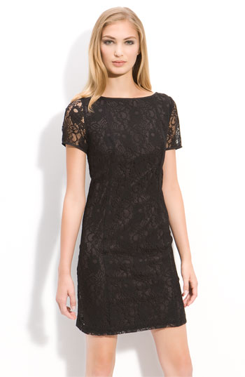 A sheer lace overlay with short sleeves veils a streamlined sheath dress for an utterly romantic look.Back zip closure.Approx. length from shoulder to hem: 36 1/2".Lined bodice